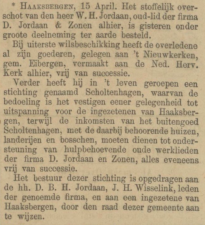 In datzelfde testament bepaalde Willem dat zijn fraaie buitenplaats Scholtenhagen na zijn overlijden aan de inwoners van Haaksbergen zou worden overgedragen. Het volkspark Scholtenhagen wordt tot op de dag van vandaag gebruikt om te verpozen en te sporten. In 2002 werd Willem postuum geëerd met de erepenning van de gemeente Haaksbergen. Zijn achterneef Derk-Loed Jordaan nam de penning in ontvangst. Met een glimlach wees hij erop dat de parken van Van Heek in Enschede (Het Volkspark, G.J. Van Heekpark en het Van Lochemspark) samen slechts 55 hectare beslaan, terwijl Scholtenhagen wel liefst 63 hectare groot is.ii