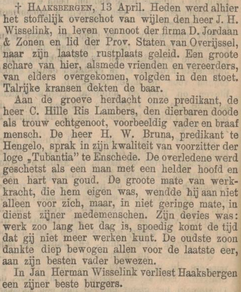 De familie Wisselink komt oorspronkelijk uit het Gelderse dorp Varsseveld. In de jaren ’30 van de negentiende eeuw verhuisde Gerrit Willem Wisselink (1807-1864) naar Haaksbergen, waar hij zich vestigde als ondermeester. Hij woonde ten huize van de oude hoofdonderwijzer Derk Jan Kerkhoven tegenover de kerk. Wisselink was voornamelijk te vinden in Buurse, waar hij aan het hoofd kwam te staan van de dorpsschool. In 1843 werd hij benoemd tot hoofdonderwijzer in Hellendoorn. Hij was inmiddels getrouwd met de 28-jarige A.G. ‘Naatje’ Jordaan (1814-1860), de oudste dochter van fabrikant Derk Jordaan en Berendina Wessels. Het echtpaar verhuisde naar Hellendoorn, waar hun zes zonen werden geboren, waarvan er één als zuigeling stierf. In 1860 overleed Naatje Wisselink-Jordaan op 45-jarige leeftijd, gevolgd door haar man, de inmiddels 57-jarige weduwnaar Gerrit Willem Wisselink, in 1864. Beiden werden begraven in Hellendoorn. Hun middelste zoon Jan Herman Wisselink (1847-1904) ligt begraven op de particuliere begraafplaats in Haaksbergen. Over hem valt veel te vertellen.